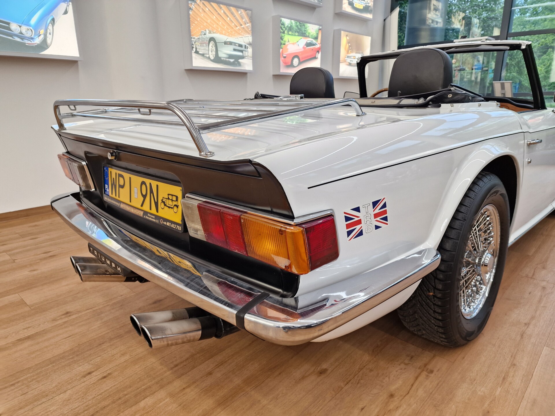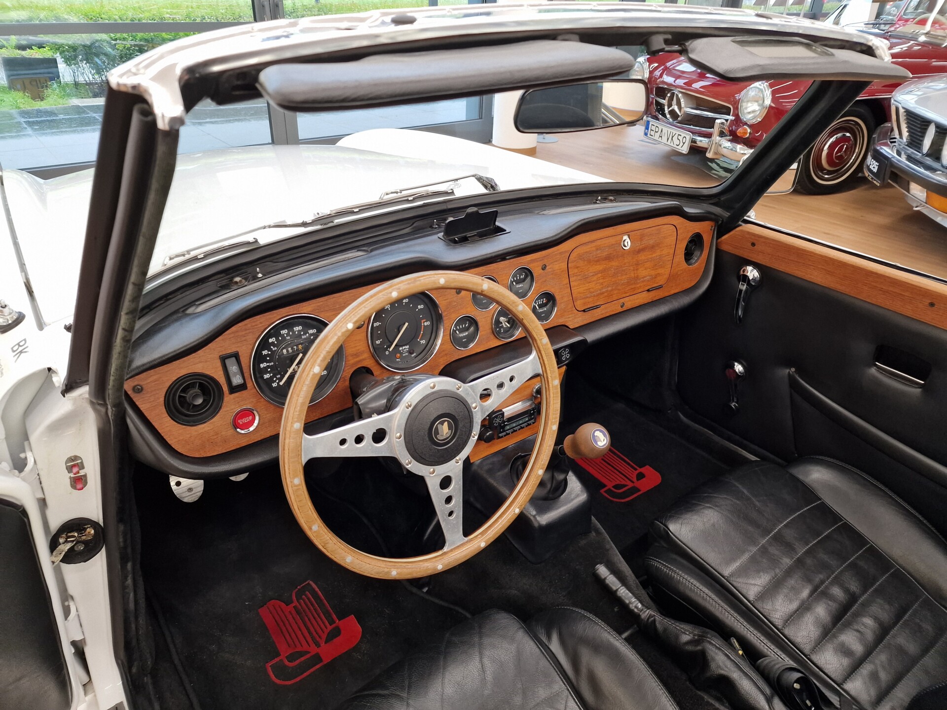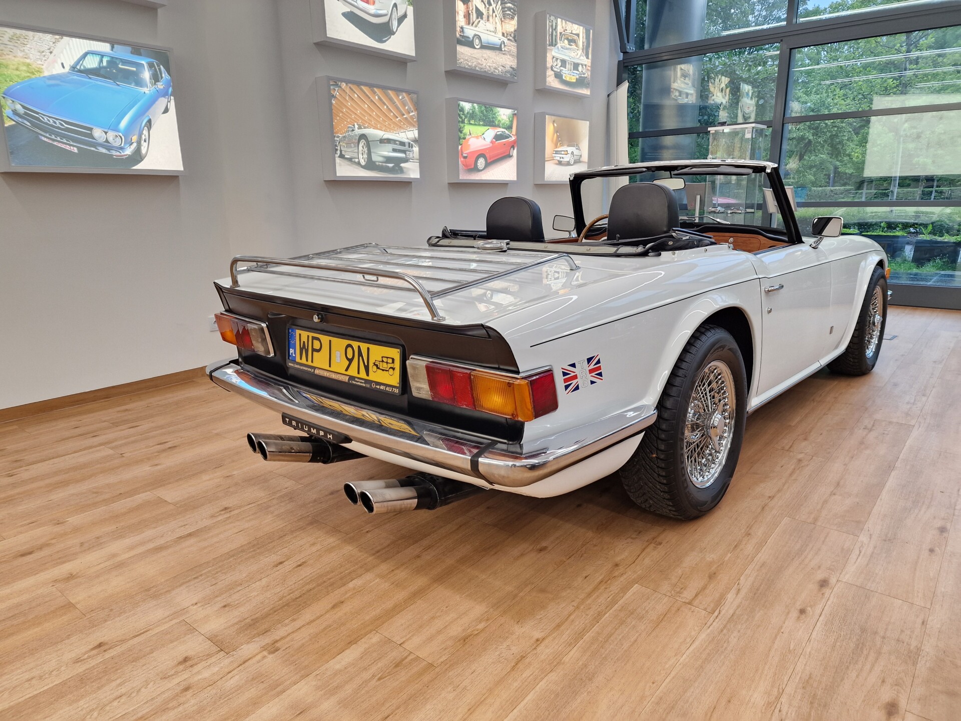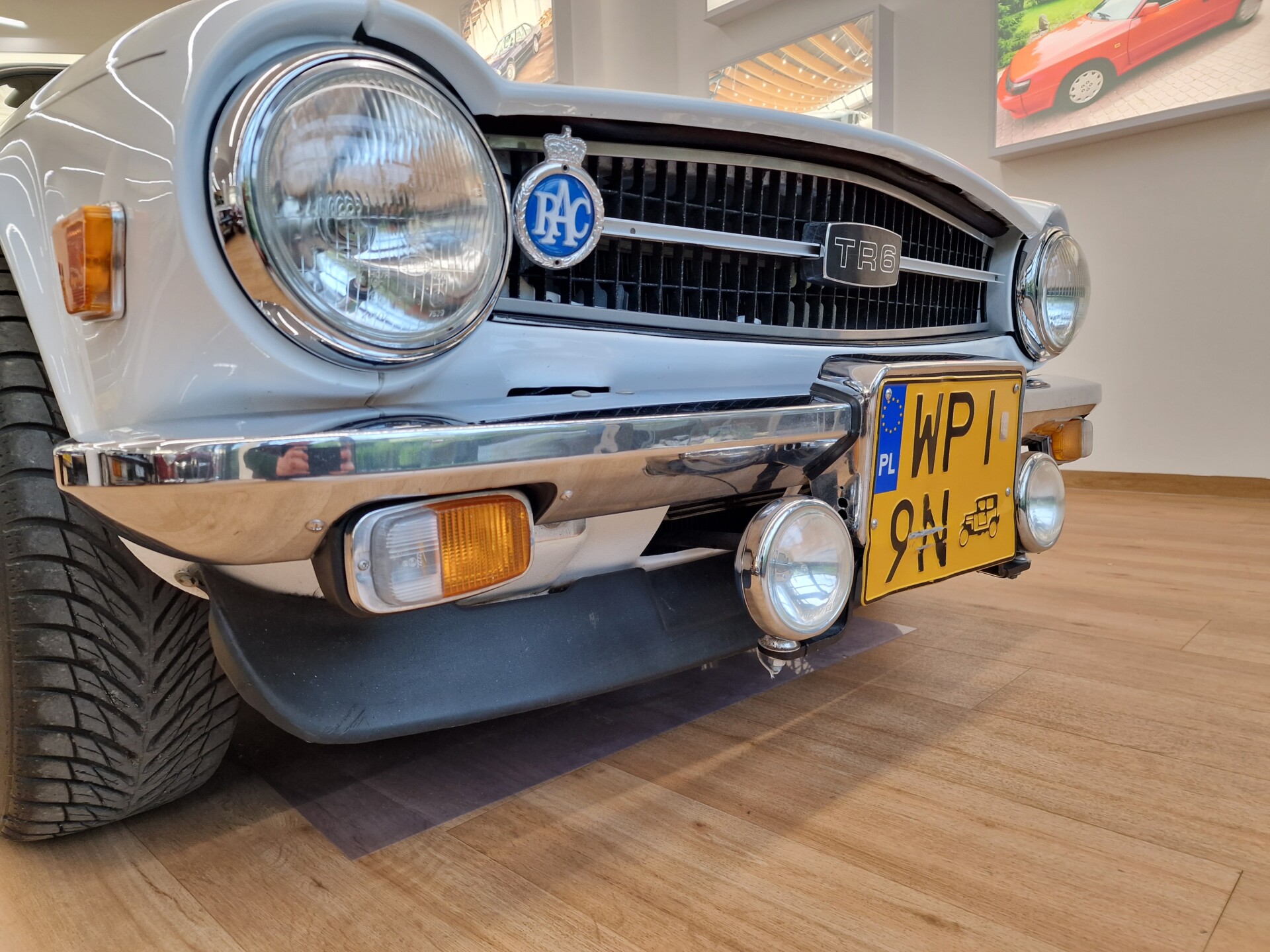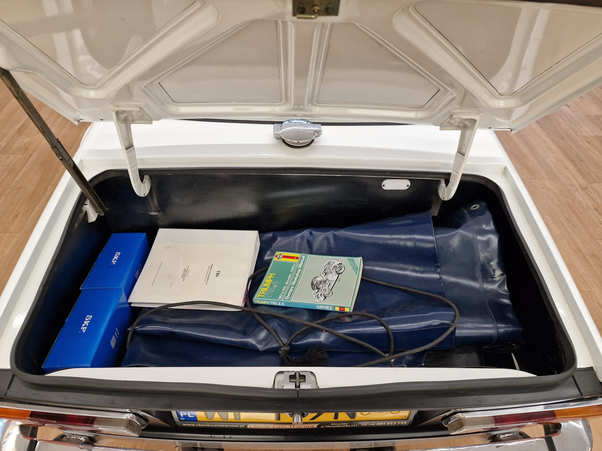 Nasz Egzemplarz – To Samochód który nadaje się w równym stopniu na relaksującą przejażdżkę po bulwarze jak i na wyścig typu hillclimb albo na dynamiczną przejazd przez szkocką przełęcz. Model z którym mamy do czynienia to wersja amerykańska z 2,5 litrową rzędową szóstką z wtryskiem Lucasa. Lecz nasz Triumph nie jest zwykłą TR6ką. Ten egzemplarz został przez poprzedniego właściciela zgodnie ze sztuką wzbogacony o kompresor, aluminiowe nakładki na pedały, sportową bardziej wydajna chłodnice i wentylowane tarczę hamulcowe. Wszystkie te akcesoria zostały zakupione w renomowanej firmie Moss Motors w Wielkiej Brytanii do tego zamontowano Sportowy filtr powietrza K&N i drewnianą kierownicę Moto – Lita, i dla bezproblemowych startów każdego dnia zapłon 123ignition. Dodatkowo do samochodu dodajemy opcjonalny twardy dach. Wszystkie te modyfikacje poskutkowały tym że samochód oferuje niesamowicie analogowe wrażenia z jazdy o które ciężko w jakimkolwiek innym samochodzie. Drogą przypomnienia ten samochód waży 1043 kg i ma 185 koni mechanicznych. Jest to idealna propozycja dla kierowców pasjonatów którzy biorą jeżdżenie samochodem na poważnie. Samochód jest po wymianie olejów w silniku, skrzyni biegów i moście a także filtrów i świec. Termostat został naprawiony i zrobiliśmy co w takim samochodzie bardzo ważne przegląd elektryki. Samochód został kompleksowo przygotowany do sezonu pozostało nim tylko jeździć i jeździć.