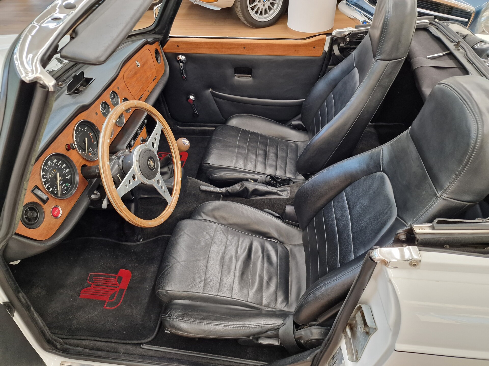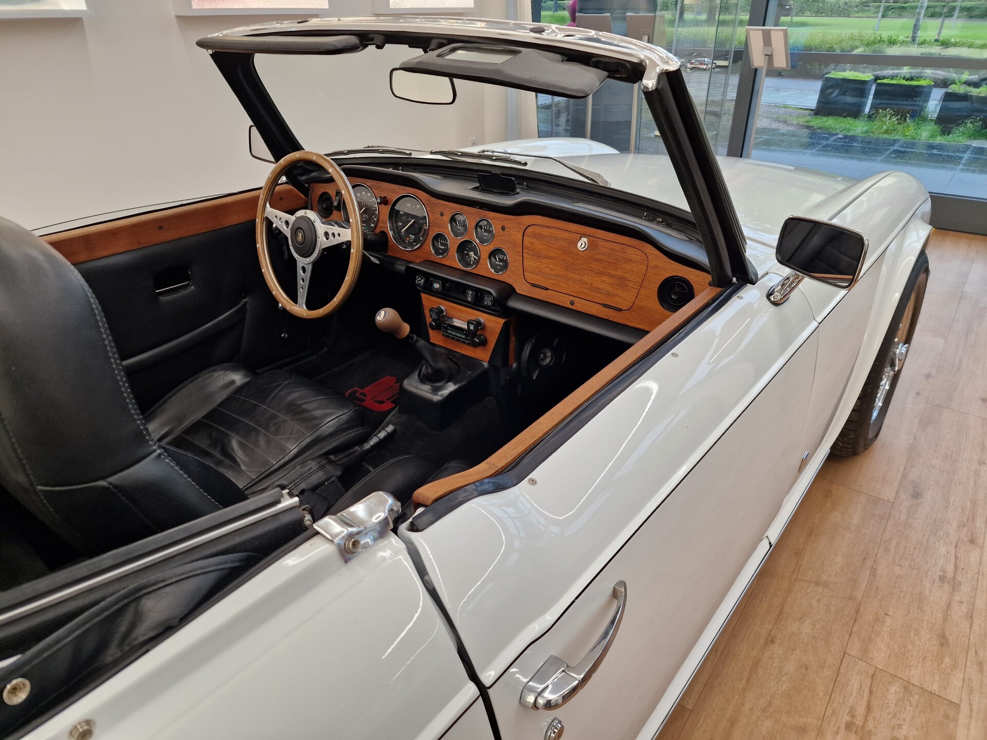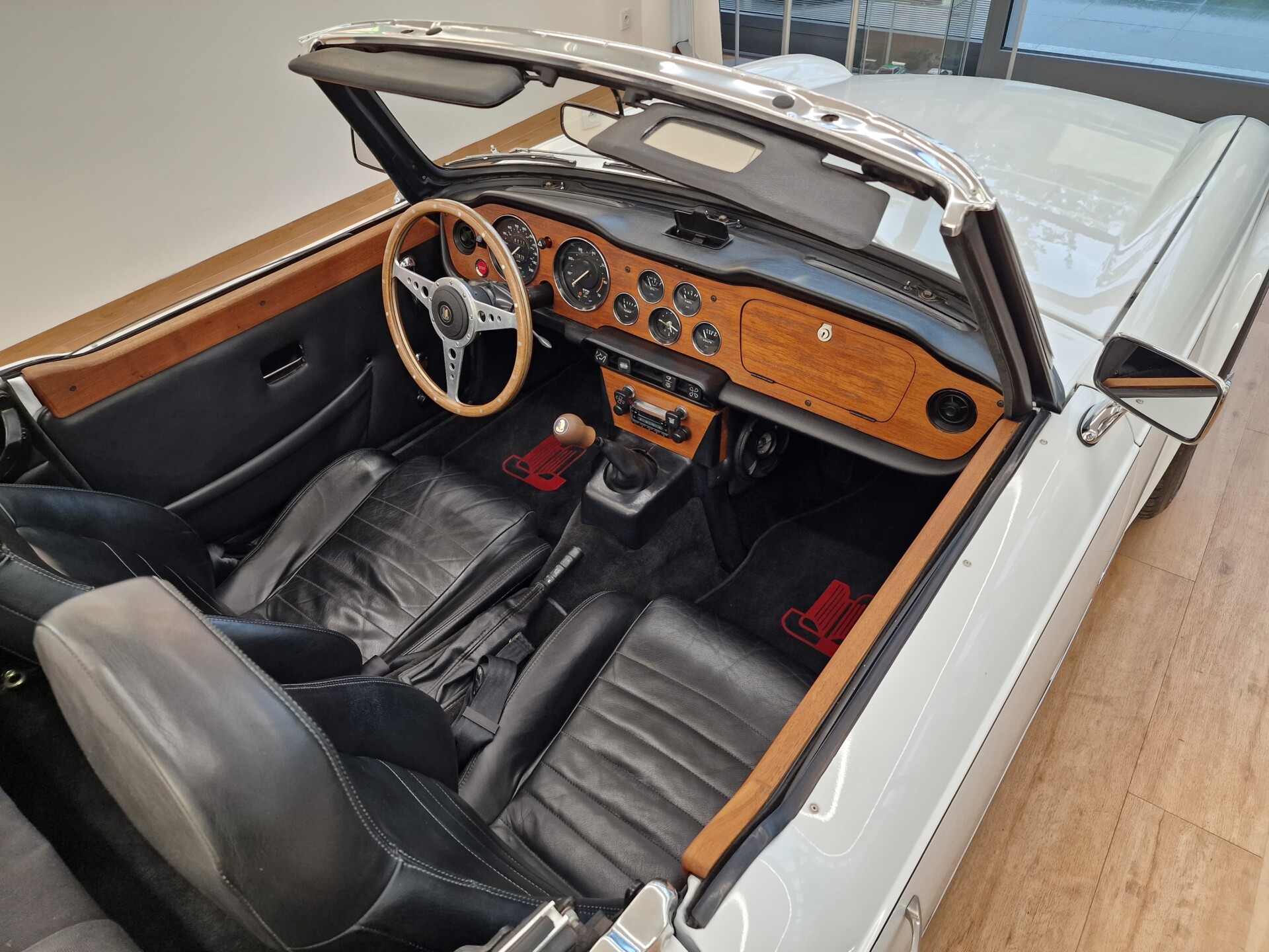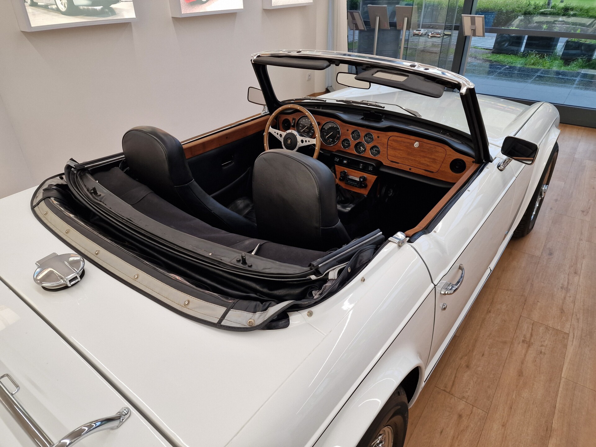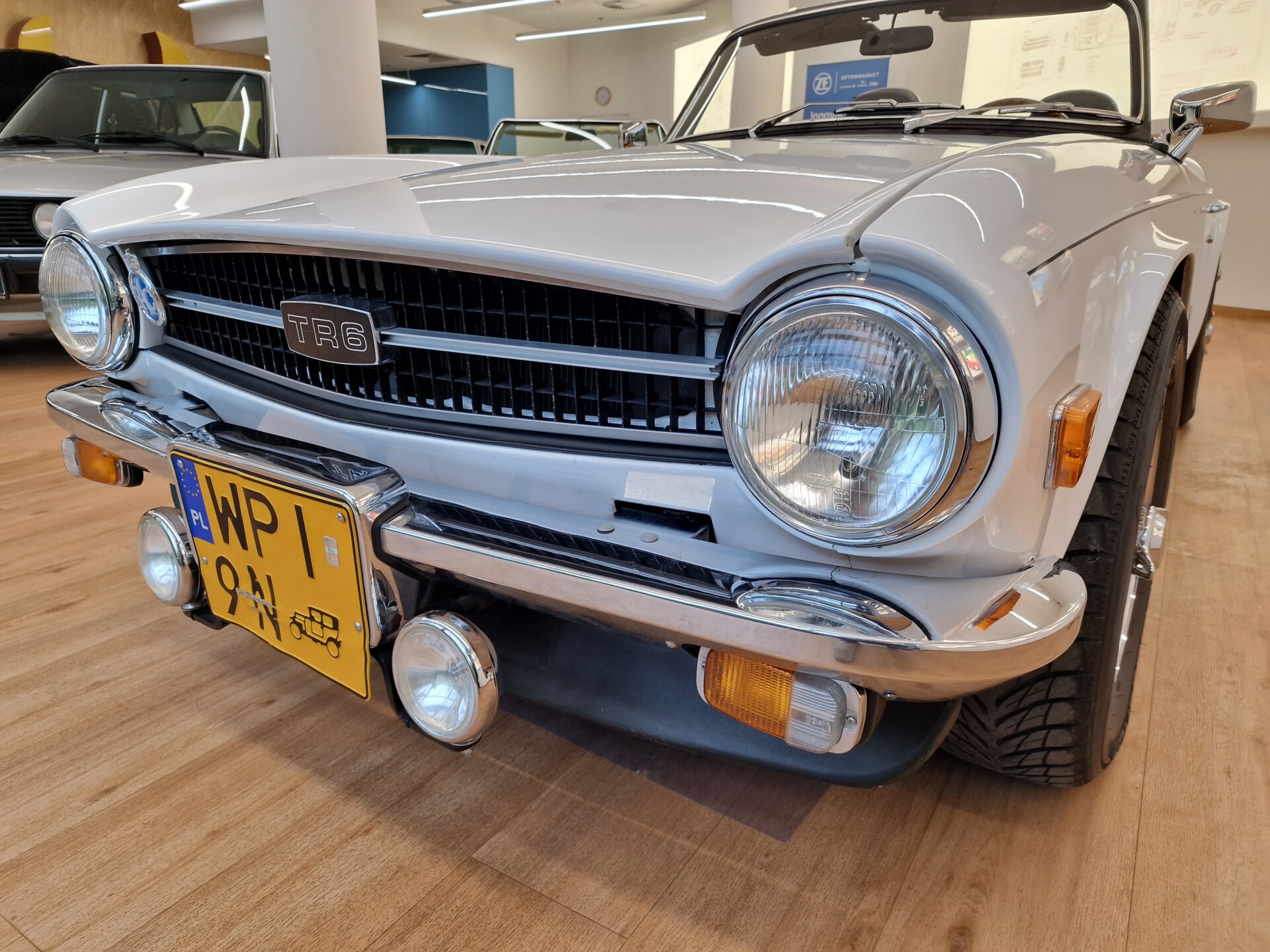 Nasz Egzemplarz – To Samochód który nadaje się w równym stopniu na relaksującą przejażdżkę po bulwarze jak i na wyścig typu hillclimb albo na dynamiczną przejazd przez szkocką przełęcz. Model z którym mamy do czynienia to wersja amerykańska z 2,5 litrową rzędową szóstką z wtryskiem Lucasa. Lecz nasz Triumph nie jest zwykłą TR6ką. Ten egzemplarz został przez poprzedniego właściciela zgodnie ze sztuką wzbogacony o kompresor, aluminiowe nakładki na pedały, sportową bardziej wydajna chłodnice i wentylowane tarczę hamulcowe. Wszystkie te akcesoria zostały zakupione w renomowanej firmie Moss Motors w Wielkiej Brytanii do tego zamontowano Sportowy filtr powietrza K&N i drewnianą kierownicę Moto – Lita, i dla bezproblemowych startów każdego dnia zapłon 123ignition. Dodatkowo do samochodu dodajemy opcjonalny twardy dach. Wszystkie te modyfikacje poskutkowały tym że samochód oferuje niesamowicie analogowe wrażenia z jazdy o które ciężko w jakimkolwiek innym samochodzie. Drogą przypomnienia ten samochód waży 1043 kg i ma 185 koni mechanicznych. Jest to idealna propozycja dla kierowców pasjonatów którzy biorą jeżdżenie samochodem na poważnie. Samochód jest po wymianie olejów w silniku, skrzyni biegów i moście a także filtrów i świec. Termostat został naprawiony i zrobiliśmy co w takim samochodzie bardzo ważne przegląd elektryki. Samochód został kompleksowo przygotowany do sezonu pozostało nim tylko jeździć i jeździć.