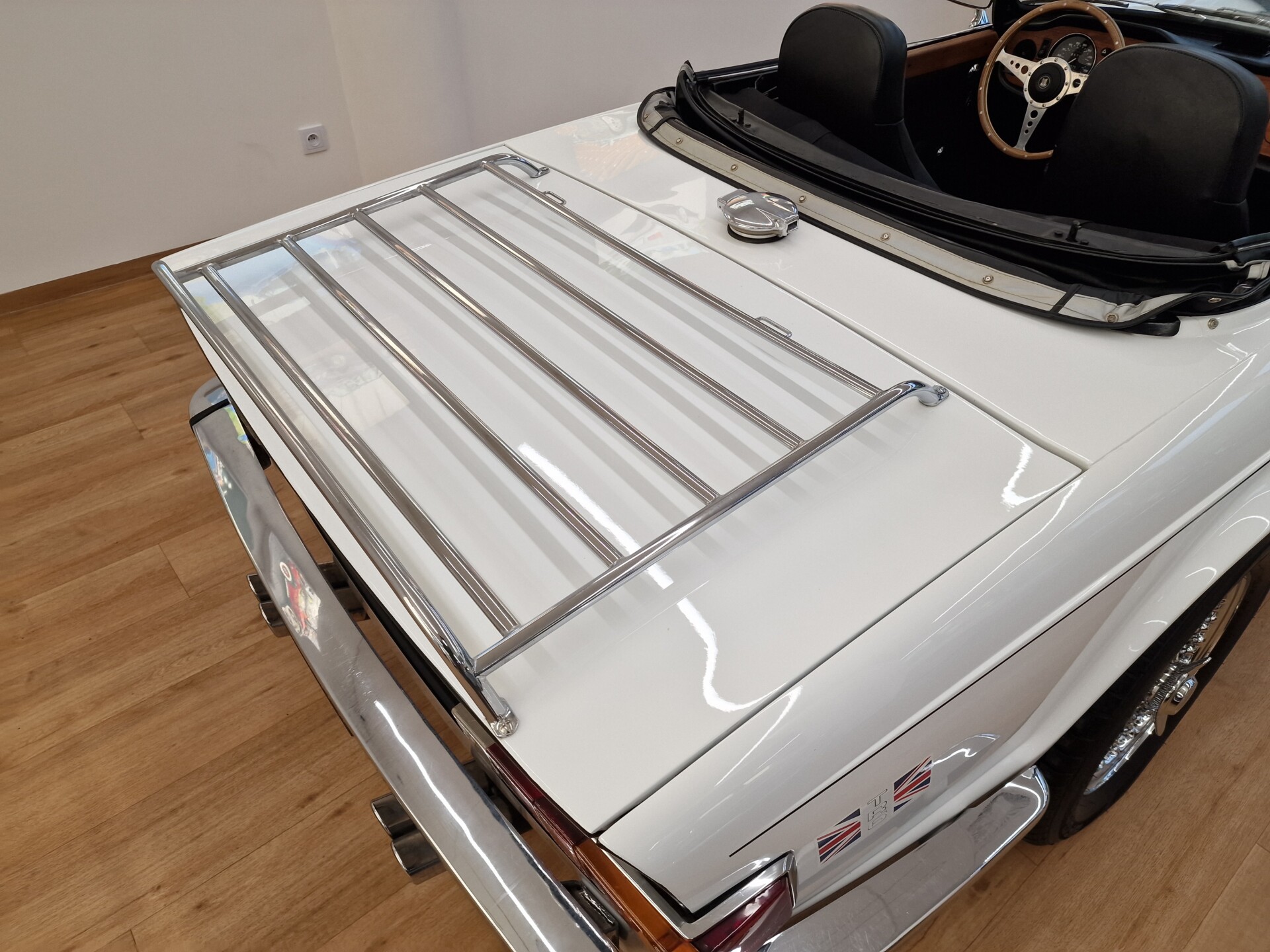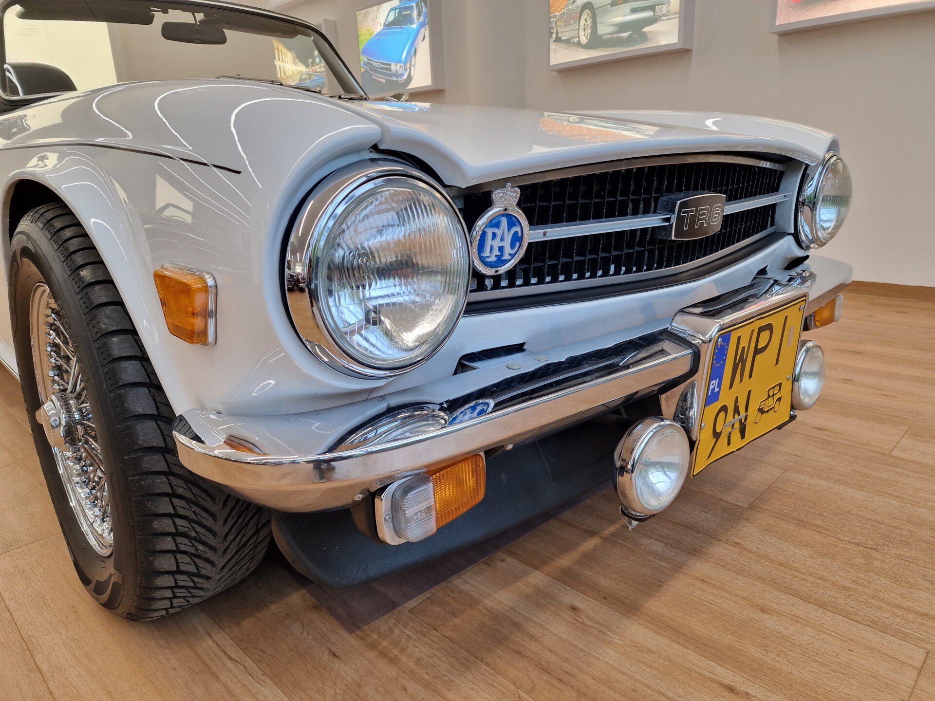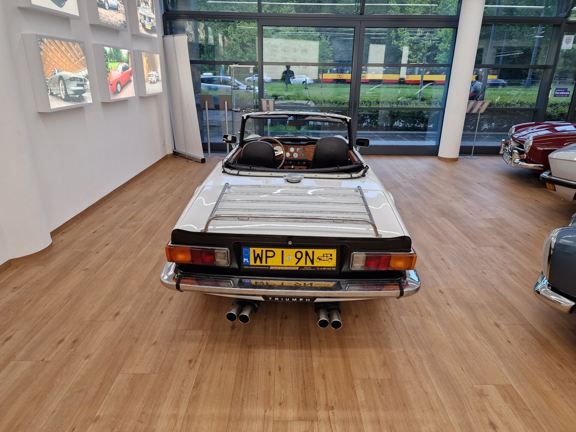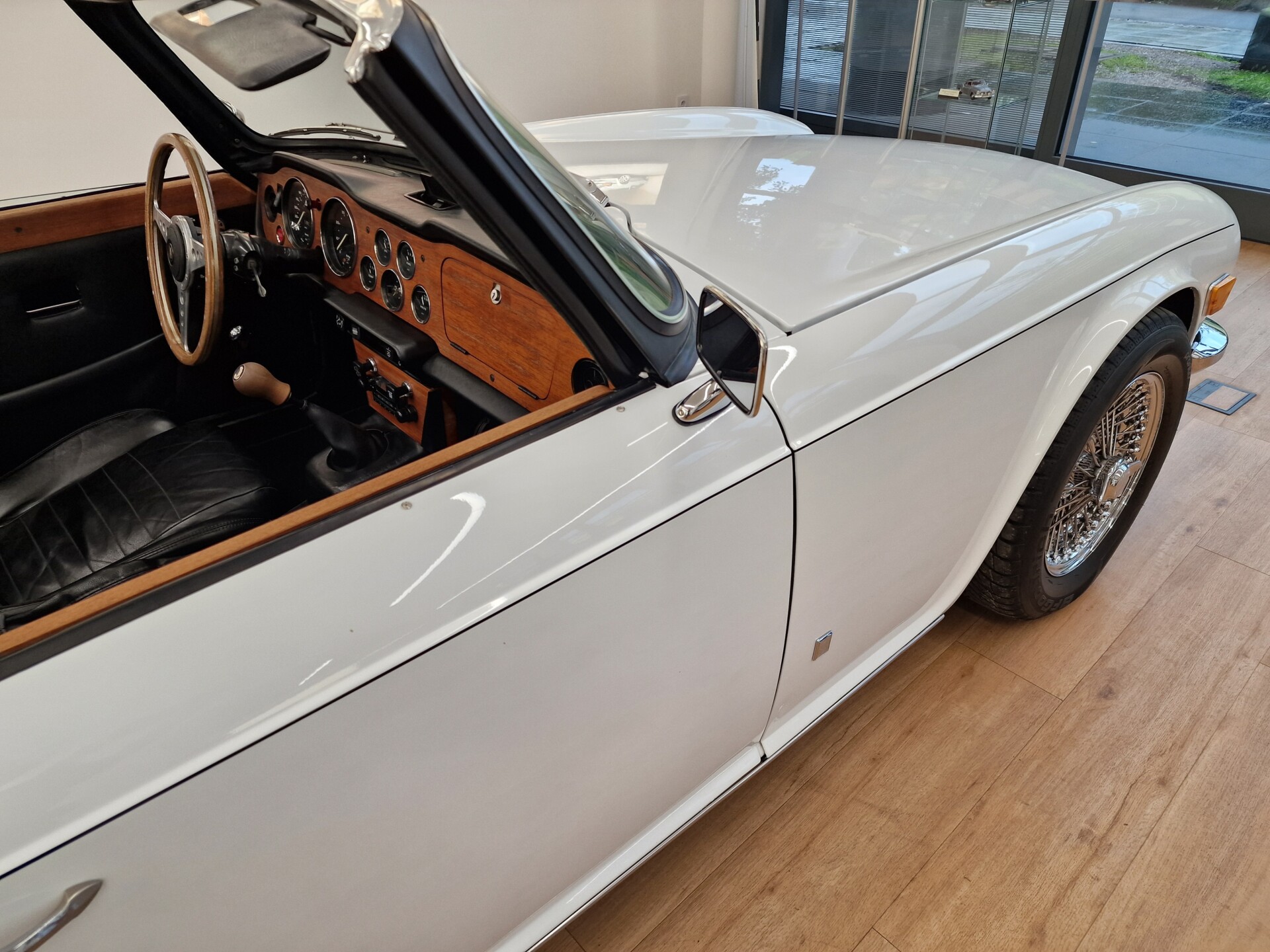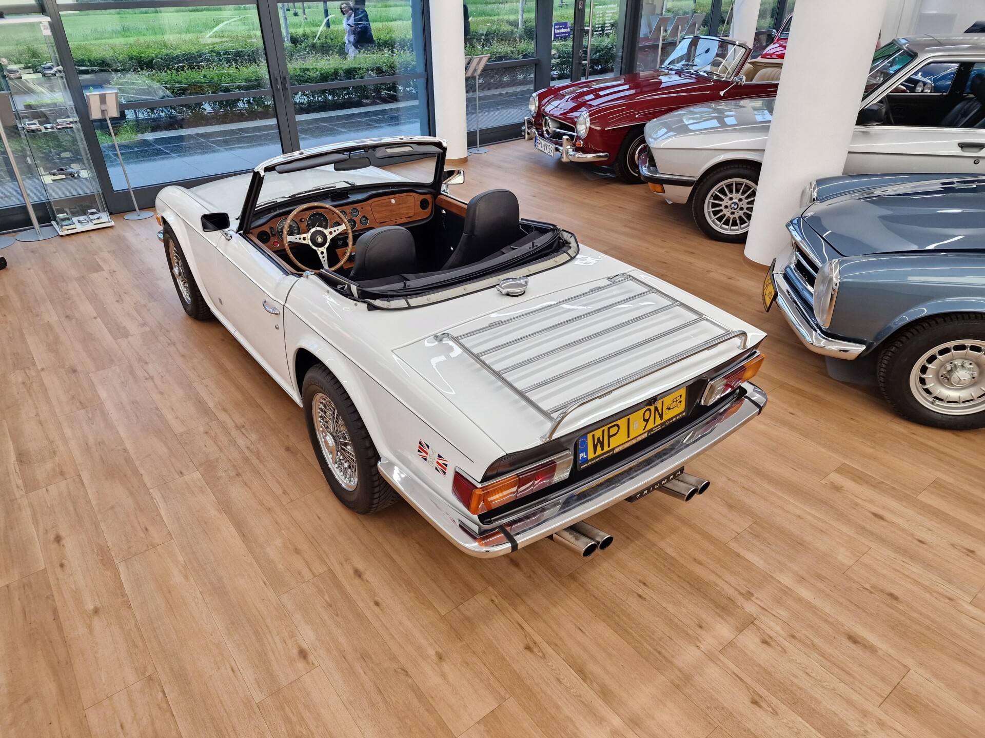 Nasz Egzemplarz – To Samochód który nadaje się w równym stopniu na relaksującą przejażdżkę po bulwarze jak i na wyścig typu hillclimb albo na dynamiczną przejazd przez szkocką przełęcz. Model z którym mamy do czynienia to wersja amerykańska z 2,5 litrową rzędową szóstką z wtryskiem Lucasa. Lecz nasz Triumph nie jest zwykłą TR6ką. Ten egzemplarz został przez poprzedniego właściciela zgodnie ze sztuką wzbogacony o kompresor, aluminiowe nakładki na pedały, sportową bardziej wydajna chłodnice i wentylowane tarczę hamulcowe. Wszystkie te akcesoria zostały zakupione w renomowanej firmie Moss Motors w Wielkiej Brytanii do tego zamontowano Sportowy filtr powietrza K&N i drewnianą kierownicę Moto – Lita, i dla bezproblemowych startów każdego dnia zapłon 123ignition. Dodatkowo do samochodu dodajemy opcjonalny twardy dach. Wszystkie te modyfikacje poskutkowały tym że samochód oferuje niesamowicie analogowe wrażenia z jazdy o które ciężko w jakimkolwiek innym samochodzie. Drogą przypomnienia ten samochód waży 1043 kg i ma 185 koni mechanicznych. Jest to idealna propozycja dla kierowców pasjonatów którzy biorą jeżdżenie samochodem na poważnie. Samochód jest po wymianie olejów w silniku, skrzyni biegów i moście a także filtrów i świec. Termostat został naprawiony i zrobiliśmy co w takim samochodzie bardzo ważne przegląd elektryki. Samochód został kompleksowo przygotowany do sezonu pozostało nim tylko jeździć i jeździć.