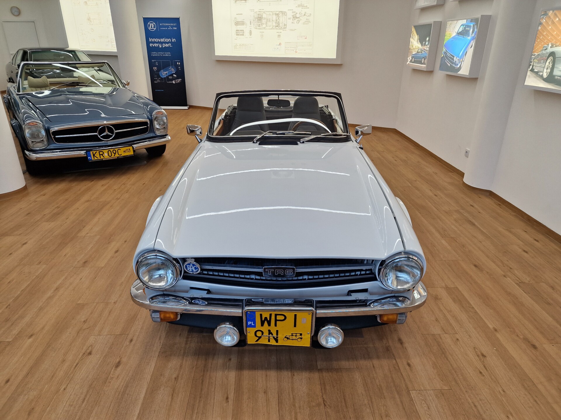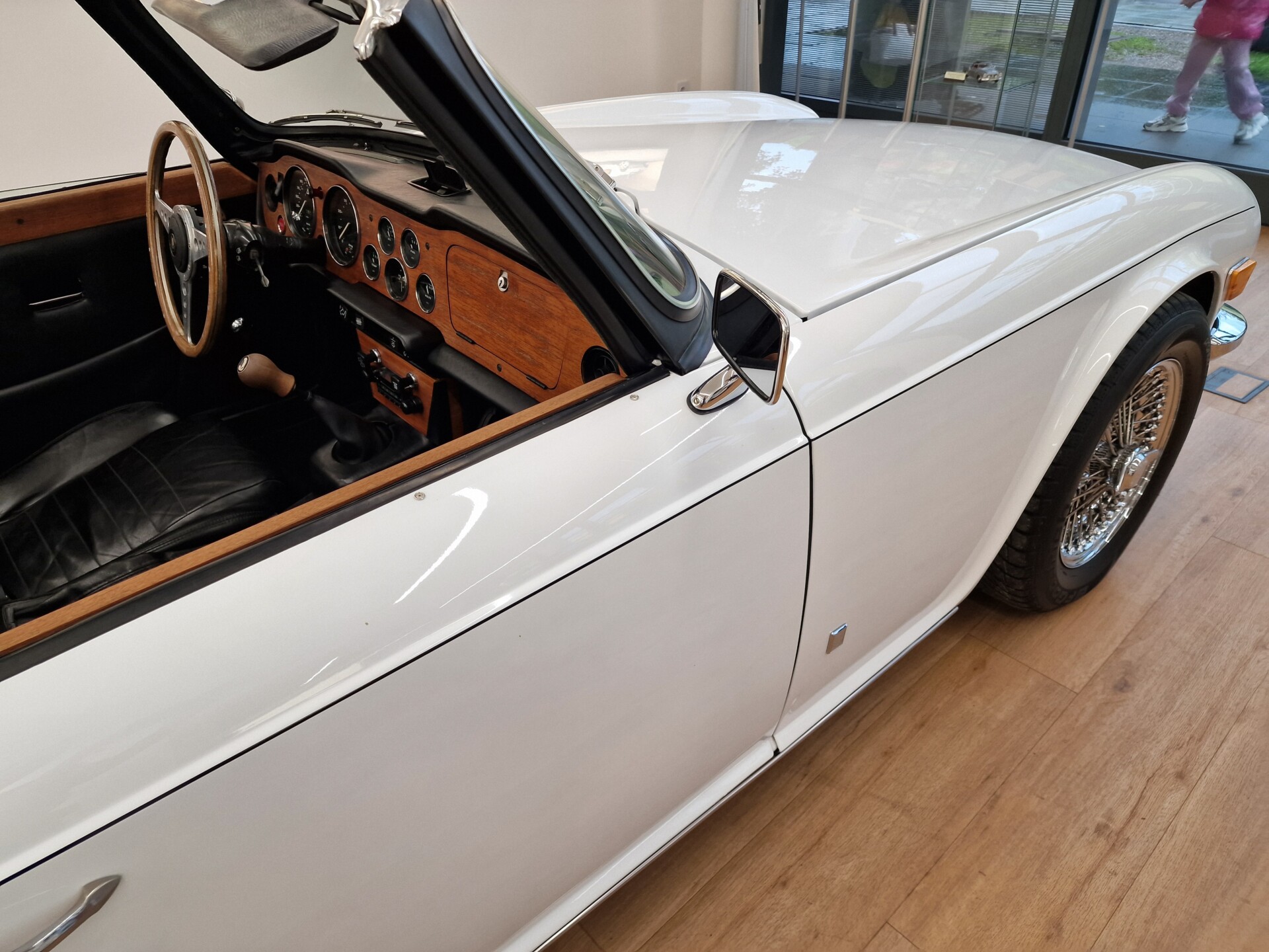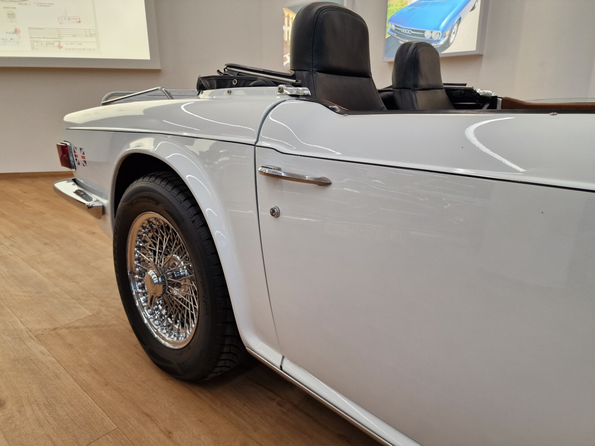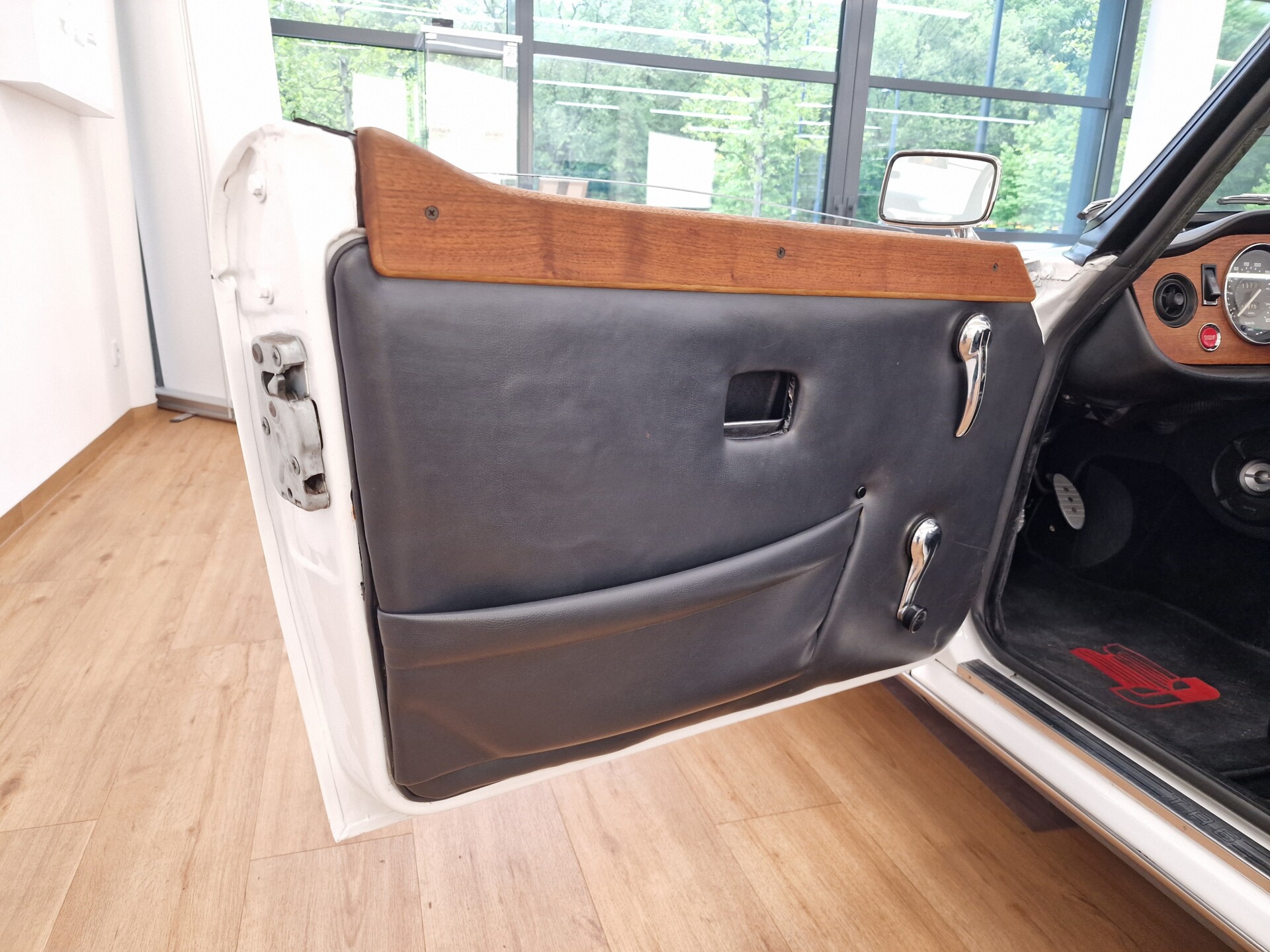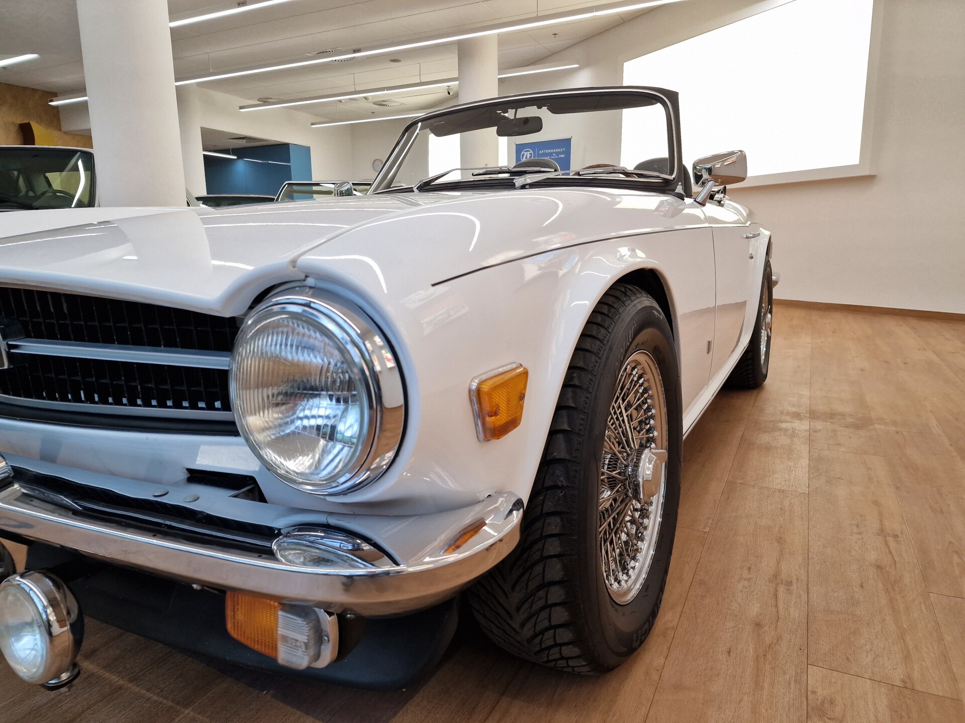 Nasz Egzemplarz – To Samochód który nadaje się w równym stopniu na relaksującą przejażdżkę po bulwarze jak i na wyścig typu hillclimb albo na dynamiczną przejazd przez szkocką przełęcz. Model z którym mamy do czynienia to wersja amerykańska z 2,5 litrową rzędową szóstką z wtryskiem Lucasa. Lecz nasz Triumph nie jest zwykłą TR6ką. Ten egzemplarz został przez poprzedniego właściciela zgodnie ze sztuką wzbogacony o kompresor, aluminiowe nakładki na pedały, sportową bardziej wydajna chłodnice i wentylowane tarczę hamulcowe. Wszystkie te akcesoria zostały zakupione w renomowanej firmie Moss Motors w Wielkiej Brytanii do tego zamontowano Sportowy filtr powietrza K&N i drewnianą kierownicę Moto – Lita, i dla bezproblemowych startów każdego dnia zapłon 123ignition. Dodatkowo do samochodu dodajemy opcjonalny twardy dach. Wszystkie te modyfikacje poskutkowały tym że samochód oferuje niesamowicie analogowe wrażenia z jazdy o które ciężko w jakimkolwiek innym samochodzie. Drogą przypomnienia ten samochód waży 1043 kg i ma 185 koni mechanicznych. Jest to idealna propozycja dla kierowców pasjonatów którzy biorą jeżdżenie samochodem na poważnie. Samochód jest po wymianie olejów w silniku, skrzyni biegów i moście a także filtrów i świec. Termostat został naprawiony i zrobiliśmy co w takim samochodzie bardzo ważne przegląd elektryki. Samochód został kompleksowo przygotowany do sezonu pozostało nim tylko jeździć i jeździć.